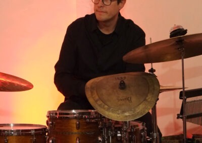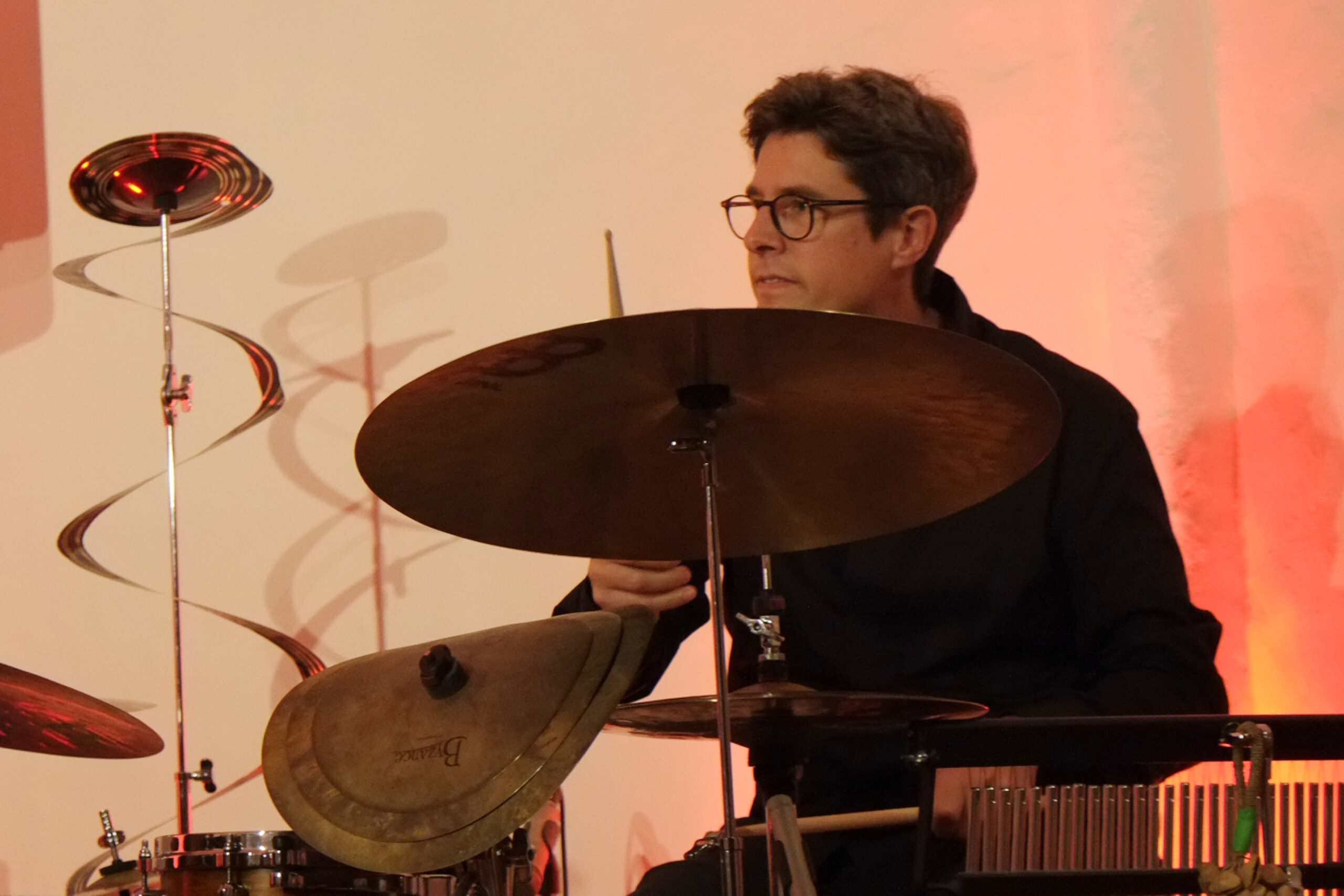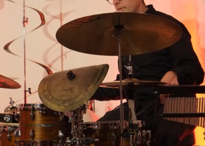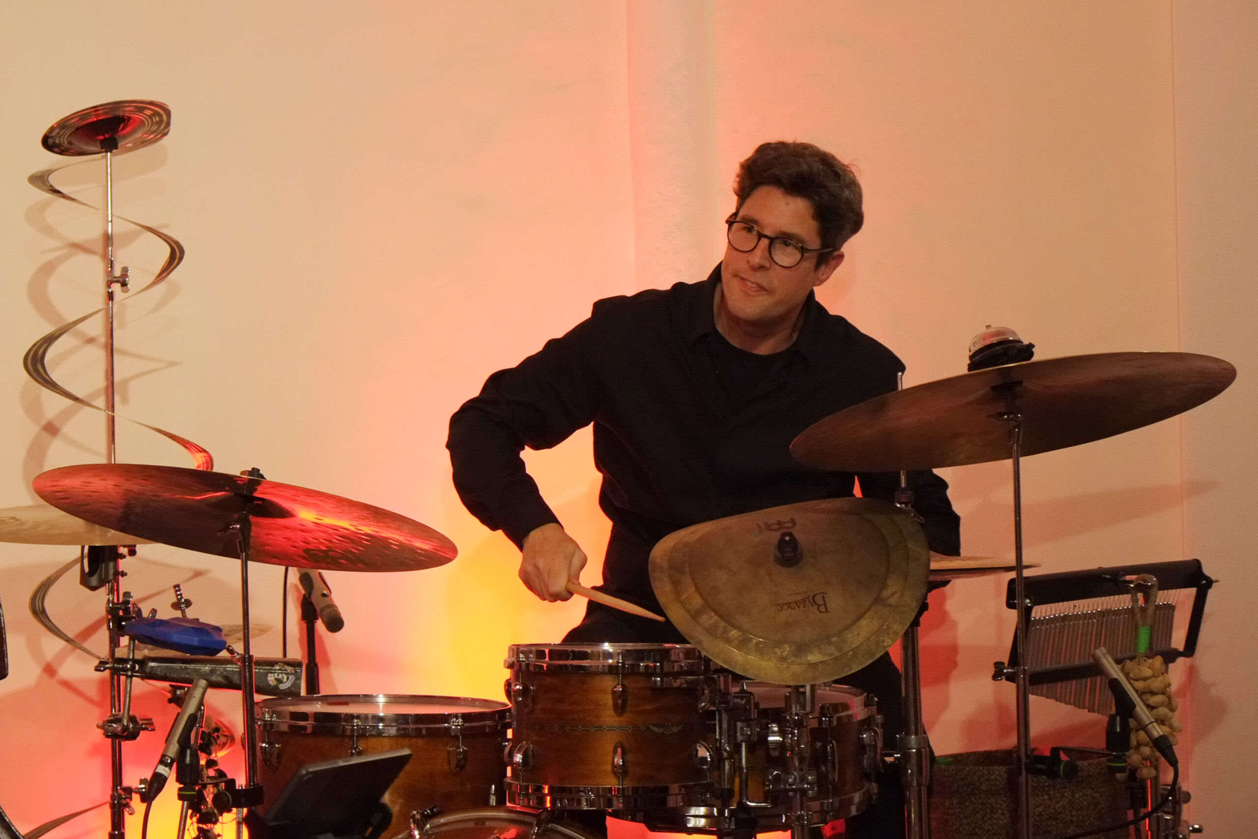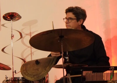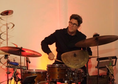 Vor allem Tobias Schulte bearbeitete sein Schlagzeug mit Schlegel, Plastikröhren, Fingern und Stöcken. Auch seine Knie, Brust und Wangen wurden zur Klangerzeugung genutzt.