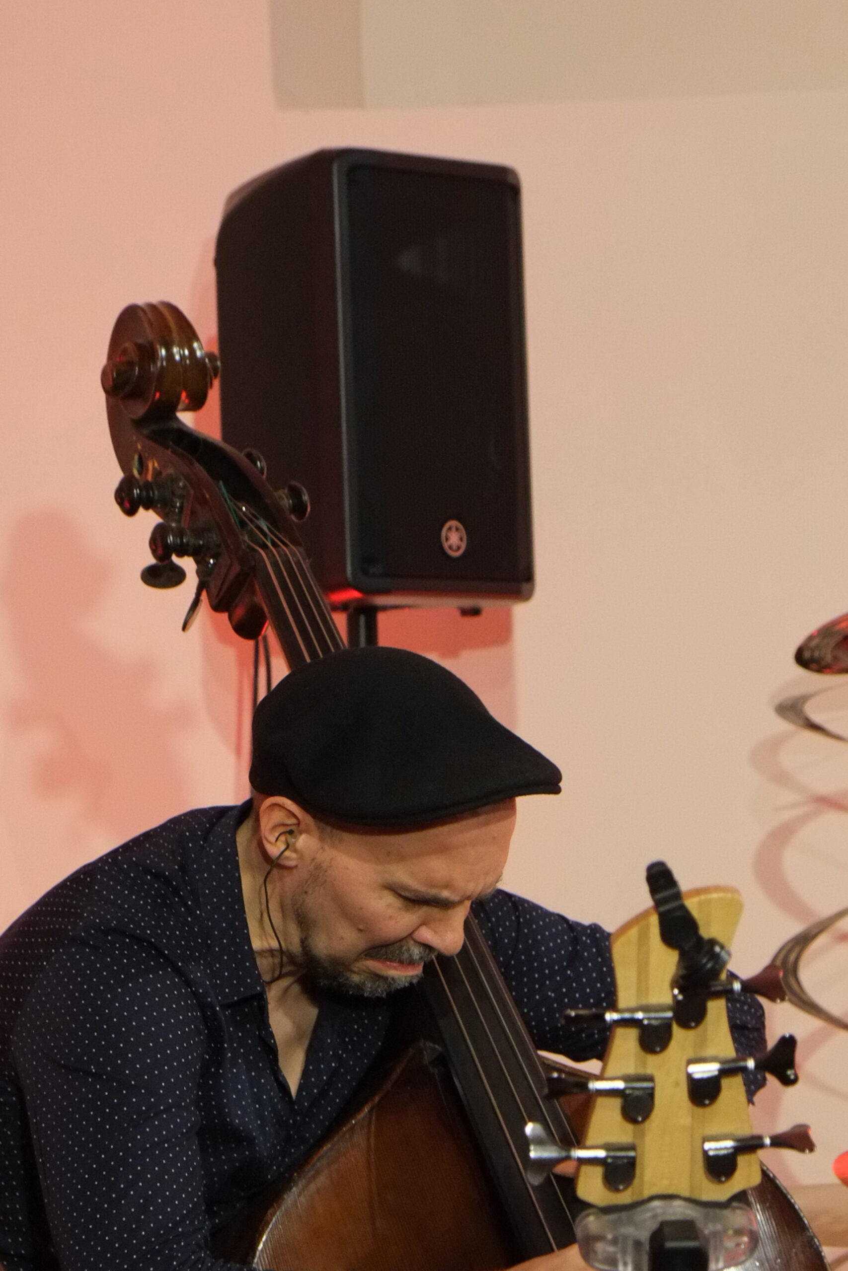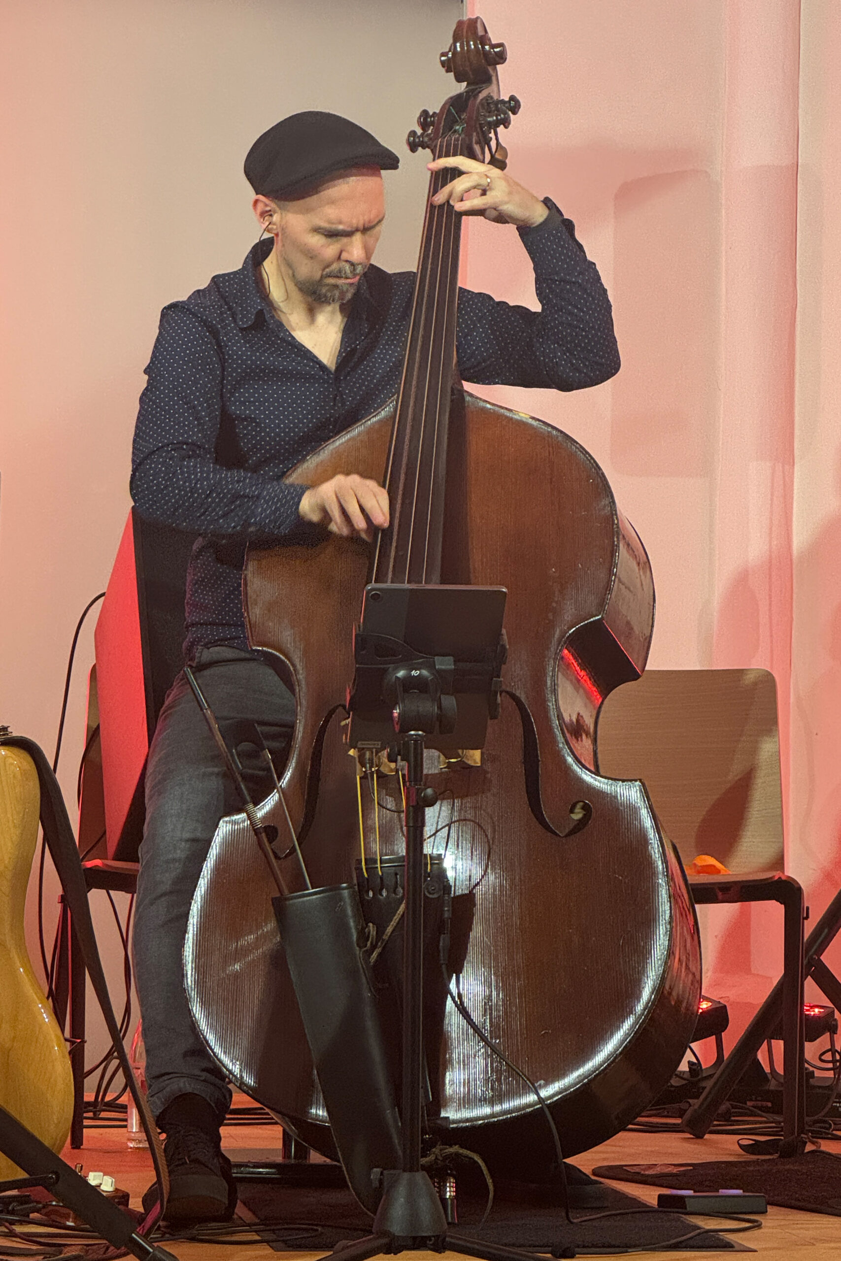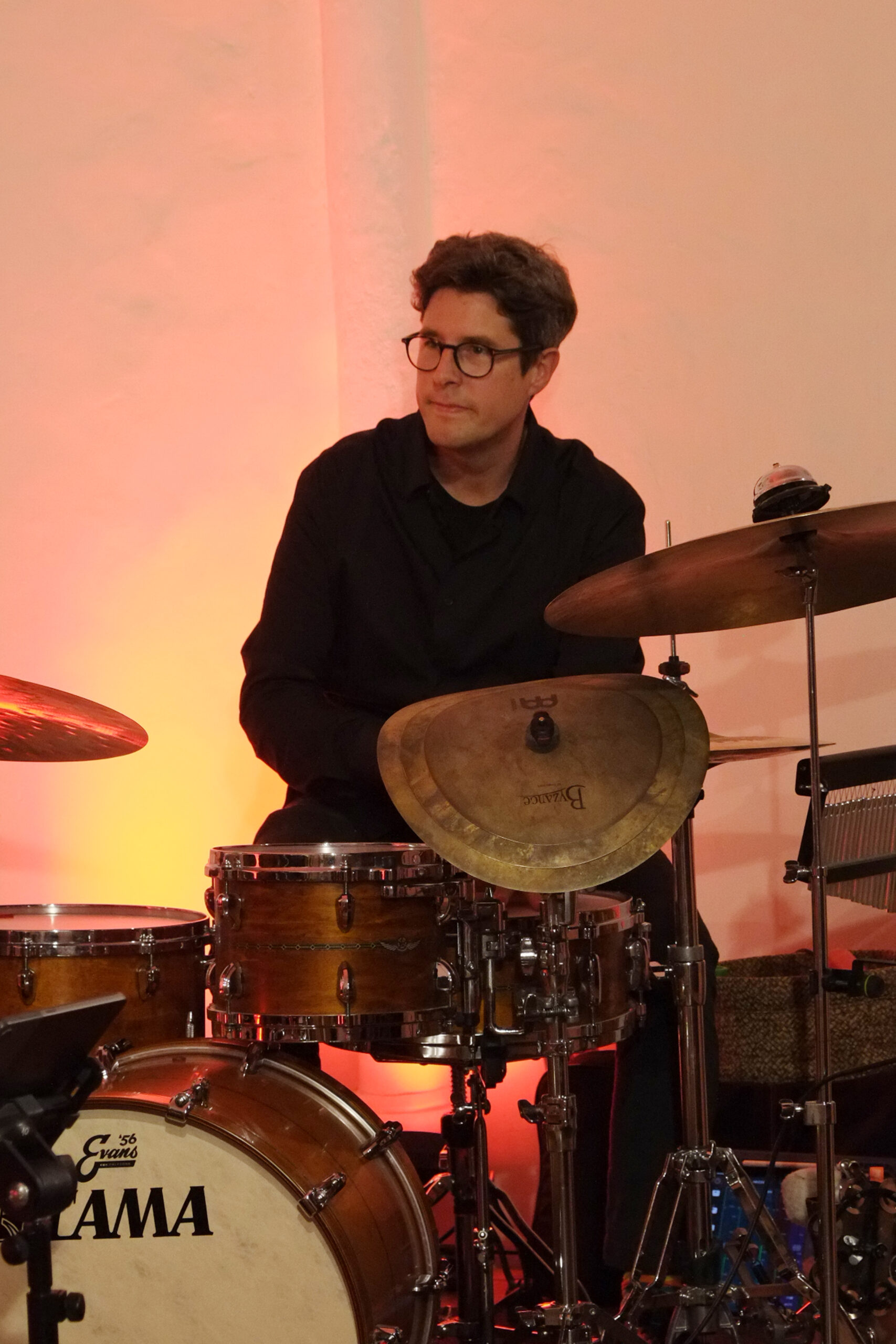 Vor allem Tobias Schulte bearbeitete sein Schlagzeug mit Schlegel, Plastikröhren, Fingern und Stöcken. Auch seine Knie, Brust und Wangen wurden zur Klangerzeugung genutzt.